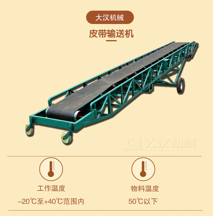 皮带机输送机可在环境温度-20℃至+40℃范围内的使用,输送物料的温度在50℃以下。