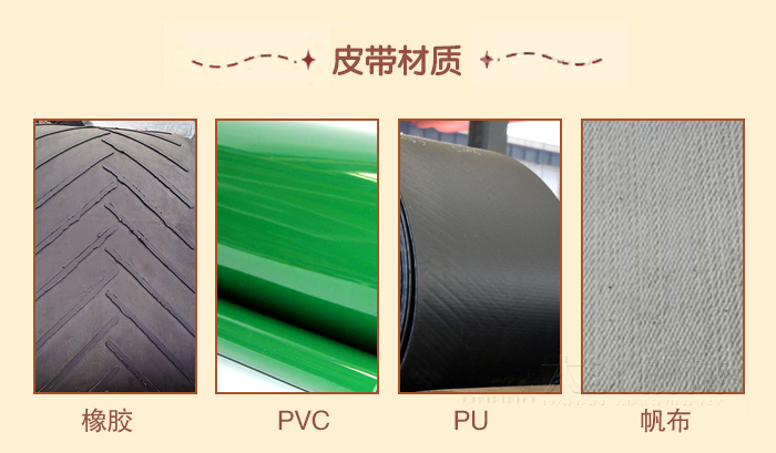 常用的胶带输送机可分为:普通帆布芯胶带输送机、钢绳芯高强度胶带输机、全防爆下运胶带输送机、难燃型胶带输送机、双速双运胶带输送机、可逆移动式胶带输送机、耐寒胶带输送机等等。输送带有橡胶、帆布、PVC、PU等多种材质。